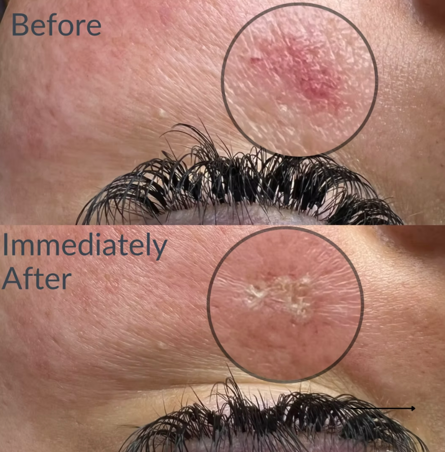 Each spot takes about a minute. Concentrated high frequency is delivered via a probe to dehydrate lesions on the skin.