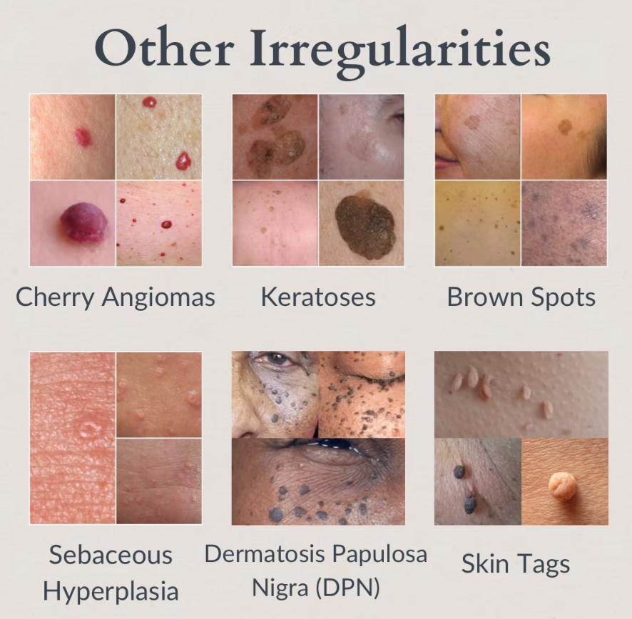 Skin tags, acne, milia, cherry angiomas, keratoses, sun spots, DPN (dermatosis papulosa nigra), sebaceous hyperplasia, visible capillaries, clogged pores.