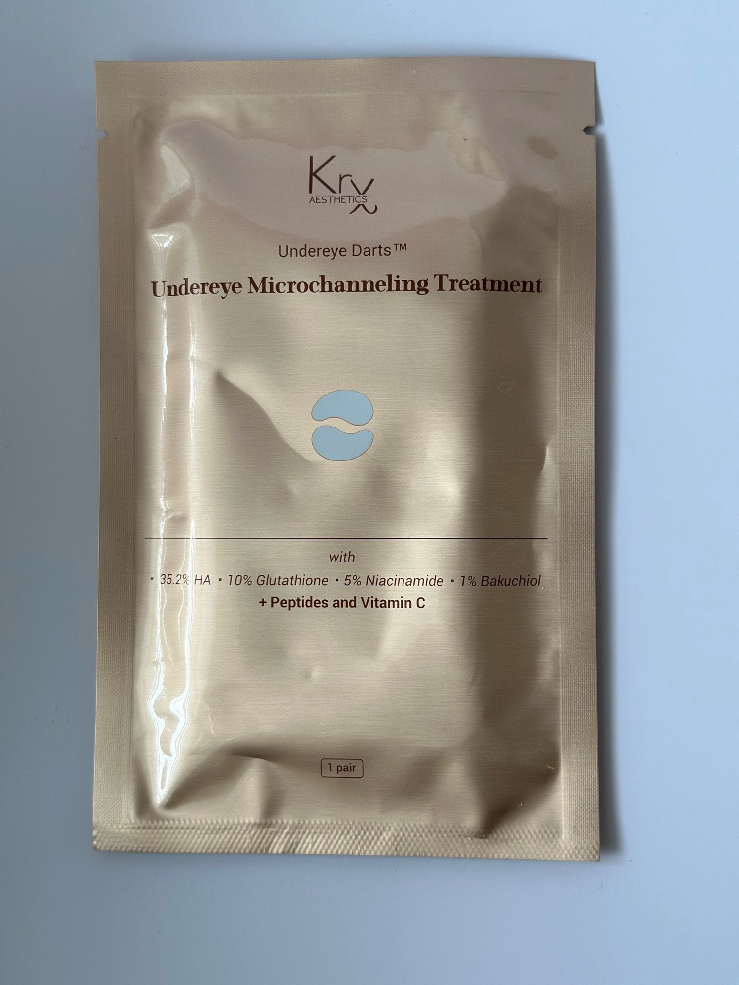 KrX's Eye Darts are designed to brighten, tighten and reduce puffy eyes while also hydrating to reduce the look of fine lines around the eye. , Contains 35.2% of combined molecular weight of hyaluronic acid, 10% Glutathione, 5% Niacinamide, 1% Bakuchoil, Vitamin C and Peptides.